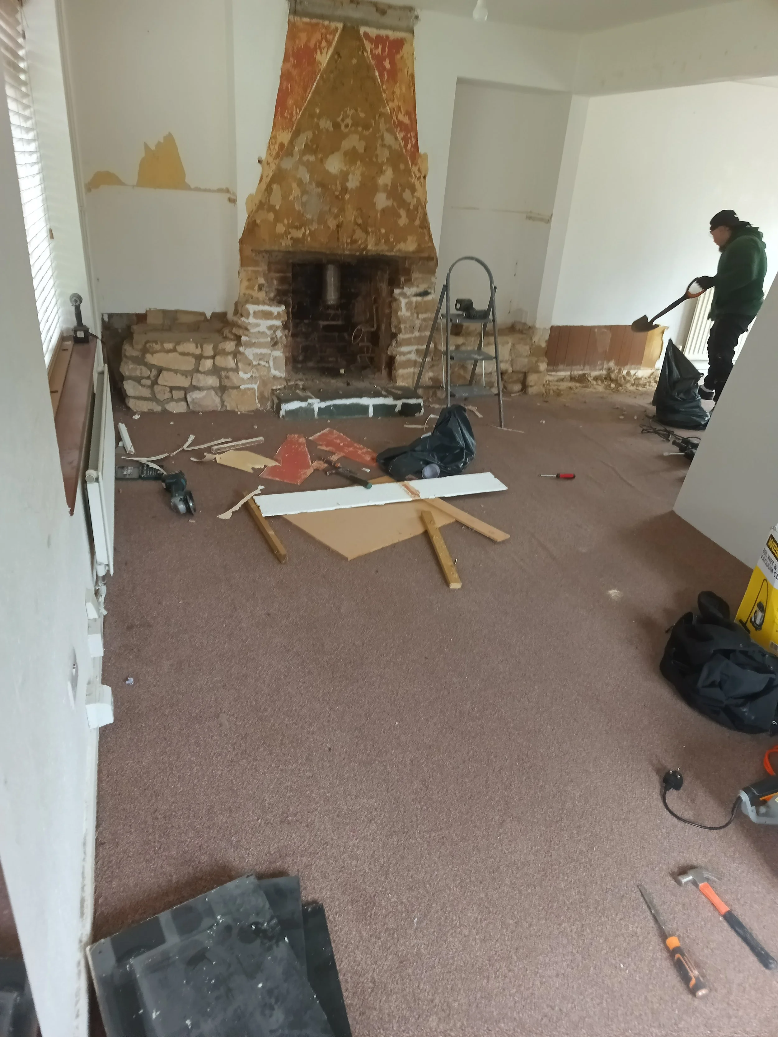 fire place removals, herringbone luxury vinyl, wallpaper, trims, banister install, full refurb